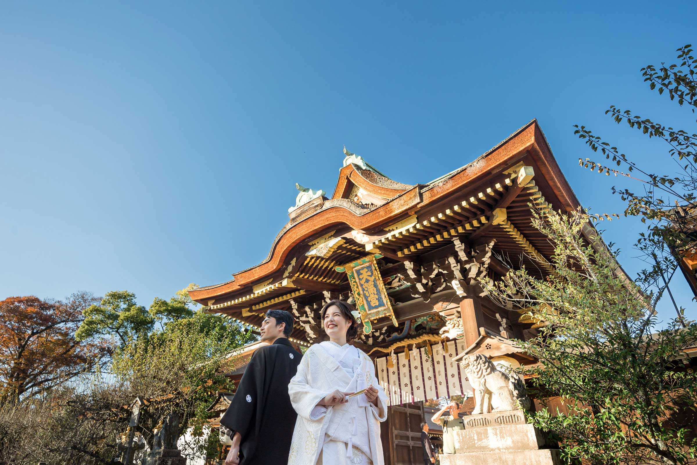 当日15:30〜 新婦様 美容室にてお仕度 16:30〜 新郎様 美容室にてお仕度 17:30 ホテル出発 18:00 北野天満宮にて結婚奉告式 18:30 ロケーションフォト撮影(約1時間) 19:40 北野天満宮出発 20:00 ホテルご帰館 20:30 お部屋でルームディナー 翌日12:00 チェックアウト