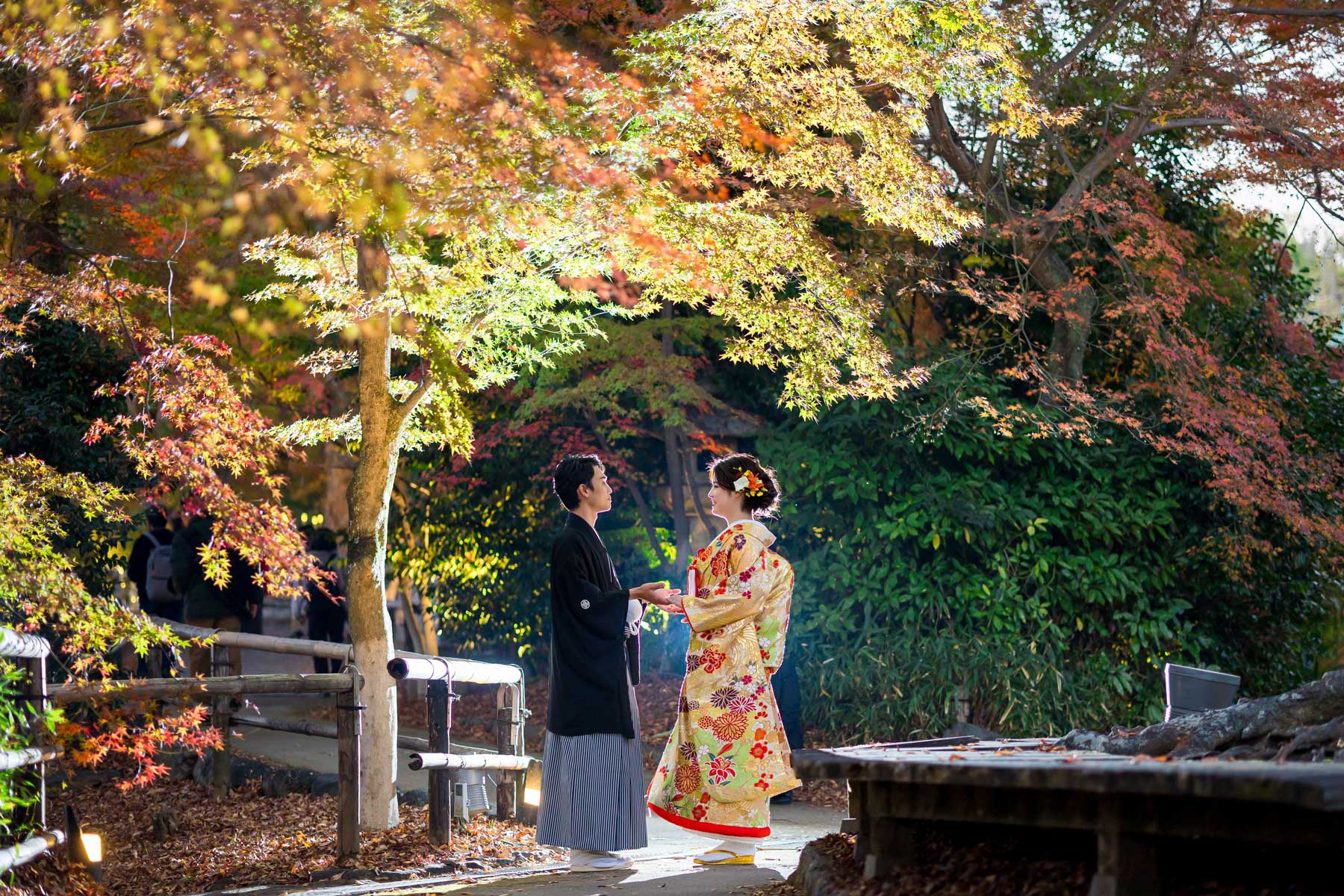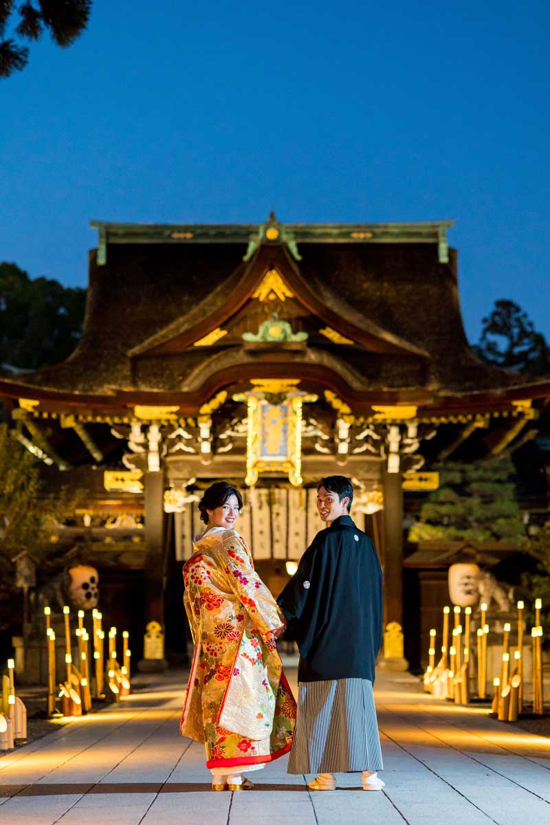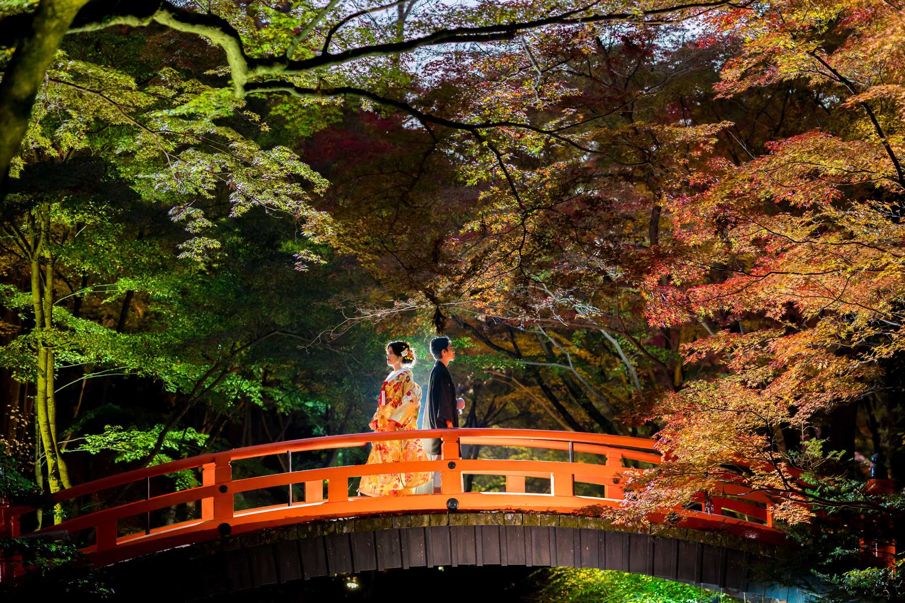 ライトアップされた境内での撮影も!本殿での厳かな結婚奉告式の様子や、梅苑や御土居のもみじ苑での撮影 随時お問い合わせ 早朝プラン