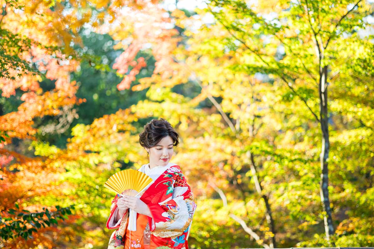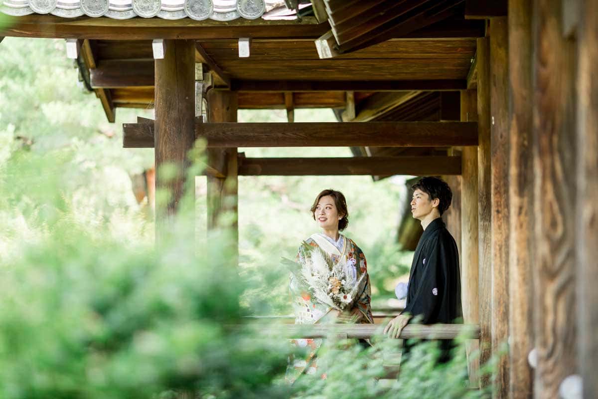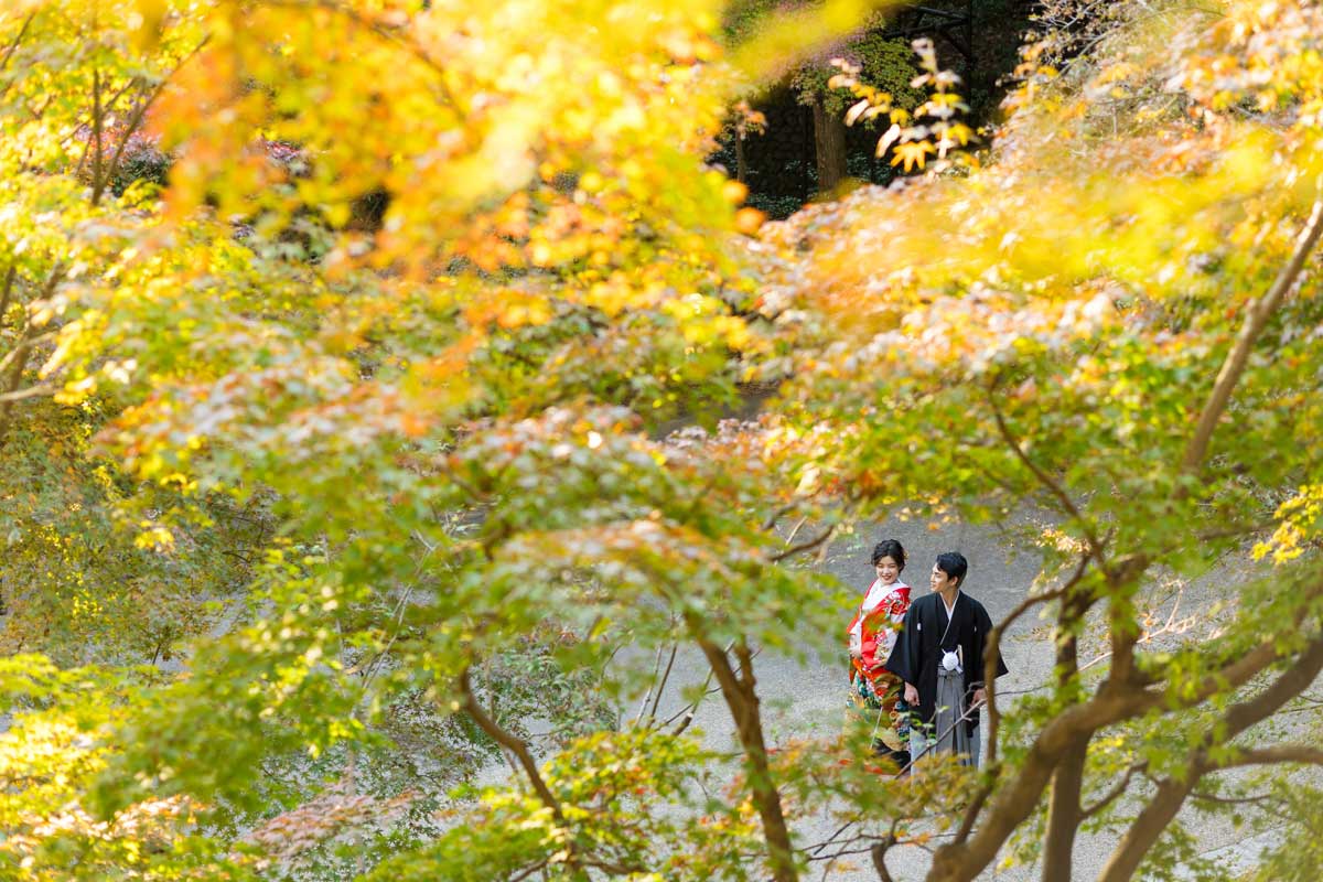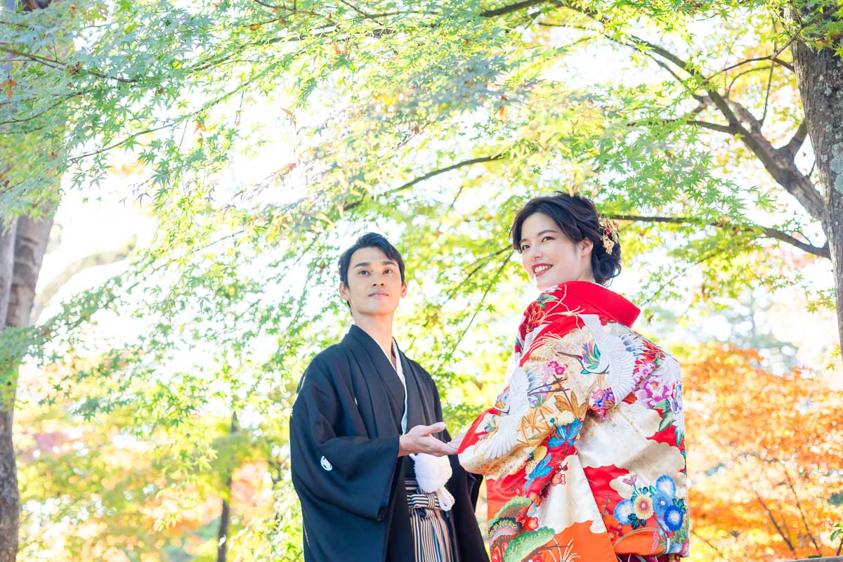 ライトアップされた境内での撮影も!本殿での厳かな結婚奉告式の様子や、梅苑や御土居のもみじ苑での撮影 随時お問い合わせ 早朝プラン