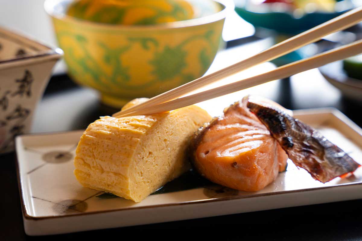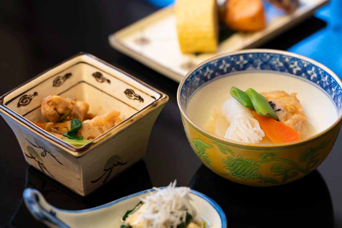 老舗「象彦」の漆器に盛り付けた季節の小鉢や人気の出汁巻玉子。