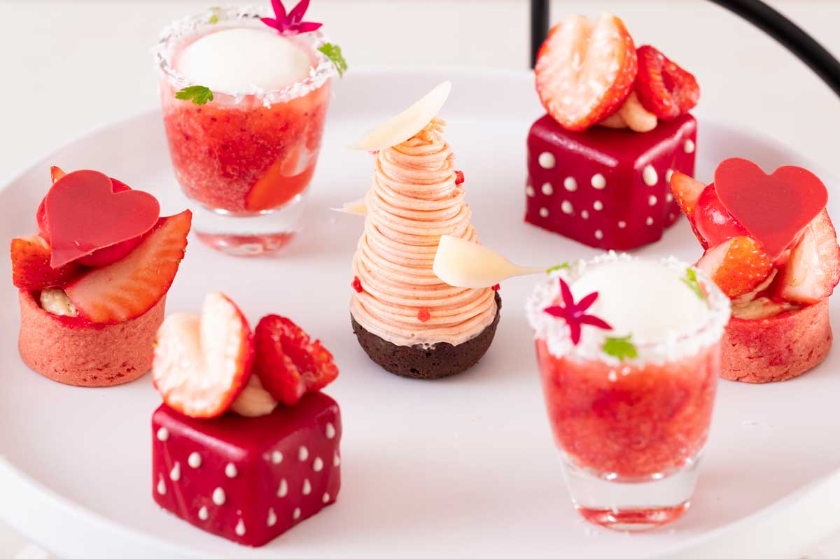 リニューアルしました!苺とほうじ茶のモンブランや苺とピスタチオのバタークリームサンド、苺とアールグレイのタルトなど、苺を贅沢に使用した可愛いスイーツが勢揃い。
