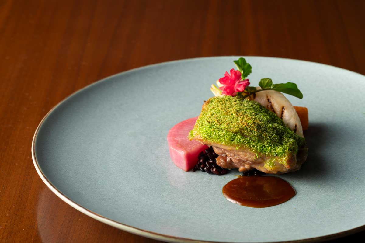心もお腹も満たされるディナーをカラフルなオードブルや季節のデザートは、お好きなものをお好きなだけ。地鶏や京都府伊根町の伊根鰤等を使ったメインディッシュにも乞うご期待。
