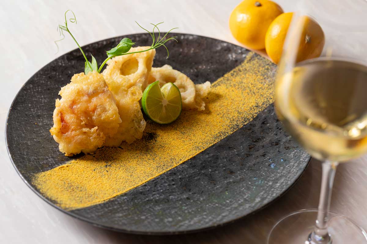 楽しむ天ぷら冬にぐっとおいしくなる伊勢海老と蓮根を目の前でサクサクの天ぷらに。爽やかなみかん塩とともにお召し上がりください。