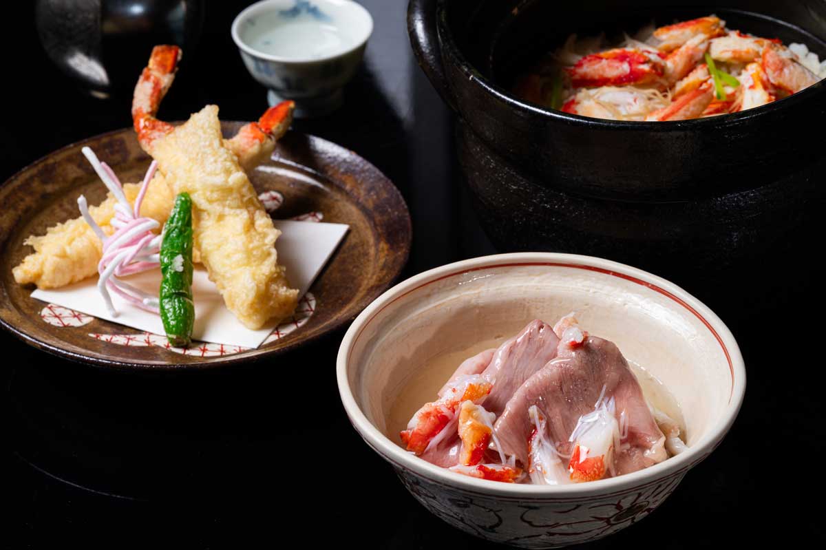 京懐石ディナー米沢牛の蟹餡かけや、湯葉の軽やかな衣が香ばしい蟹の東寺揚げ等、調理法によって変化する蟹の食感と味わいのコントラストをお楽しみください。