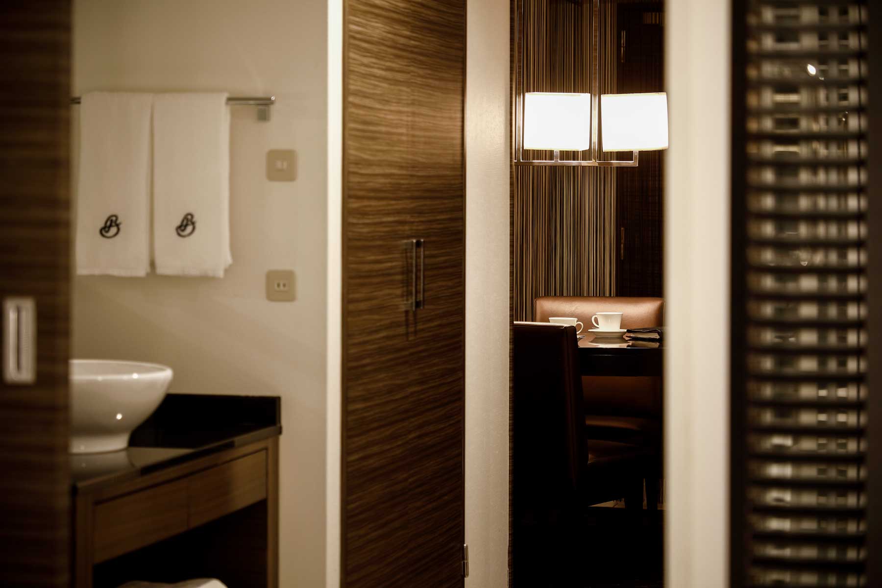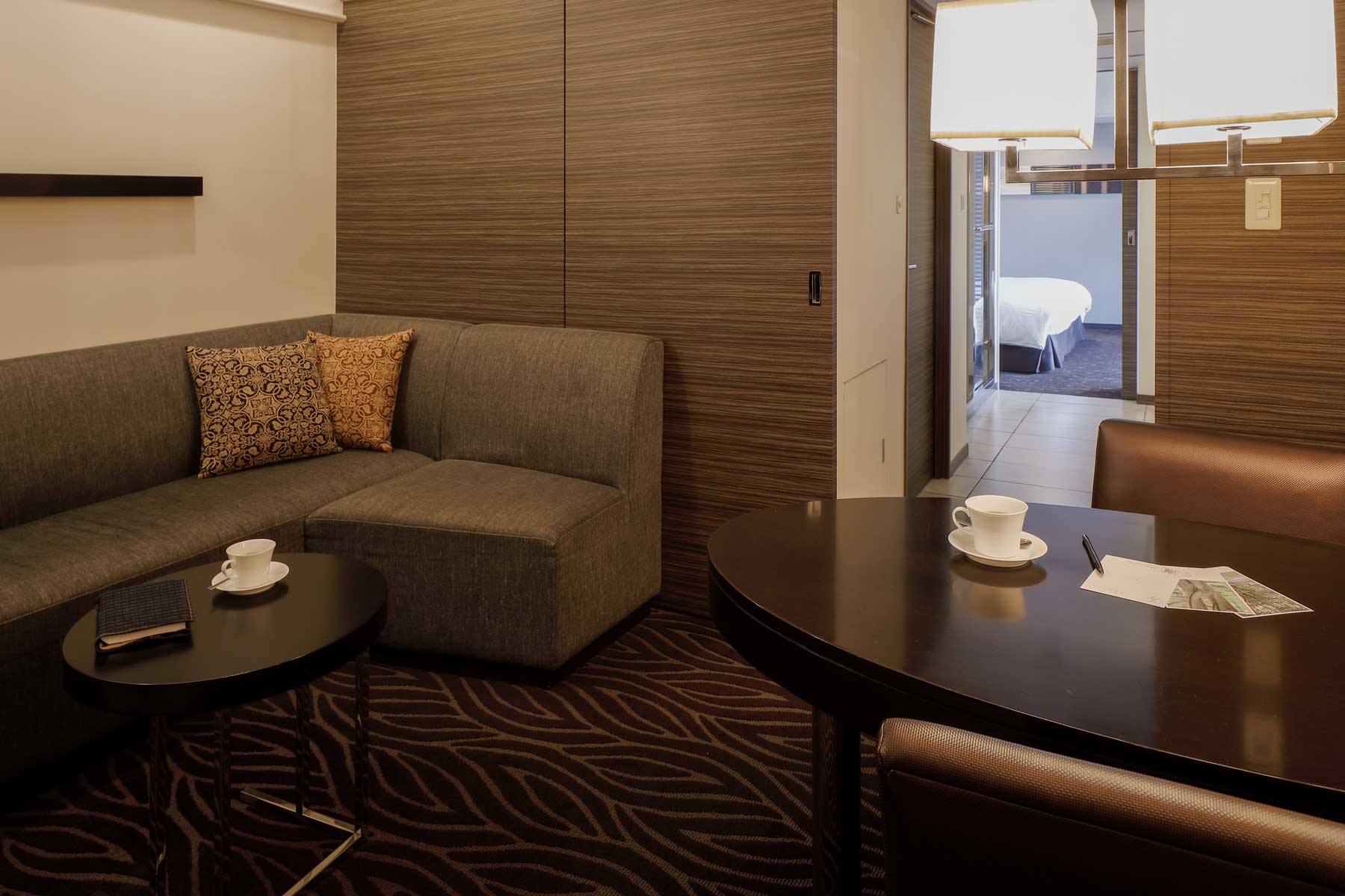 落ち着いた色調のリビングルームにはゆとりある快適なソファと、ルームサービスの朝食もゆっくりとお召し上がりいただけるダイニングテーブルを設置。 -
