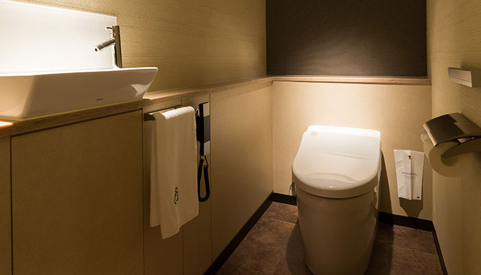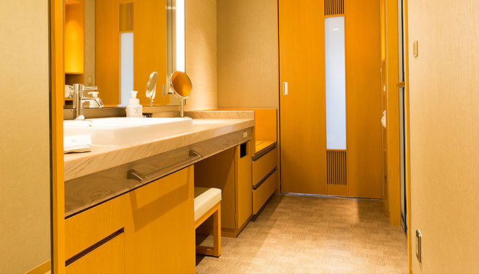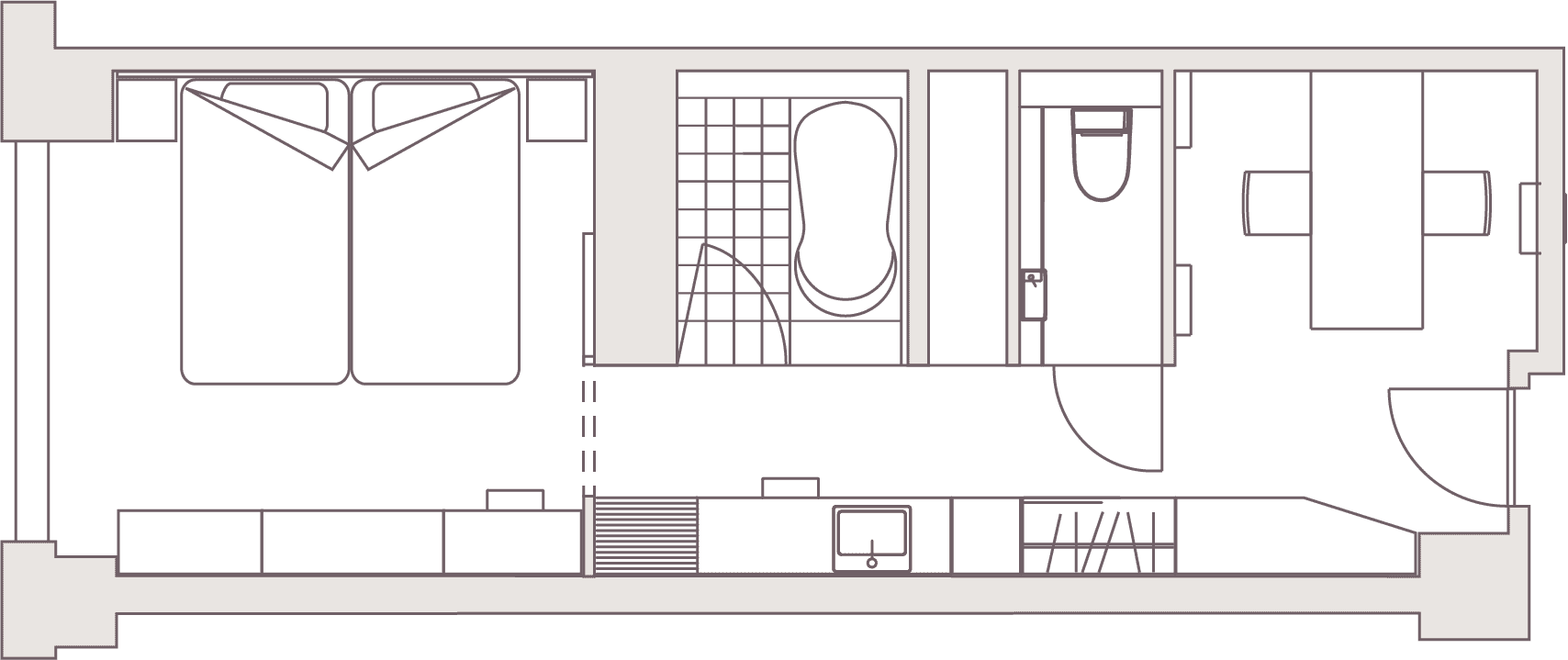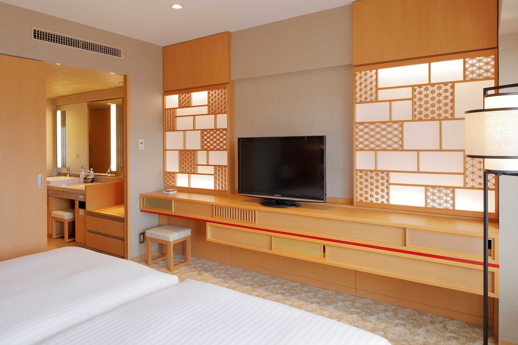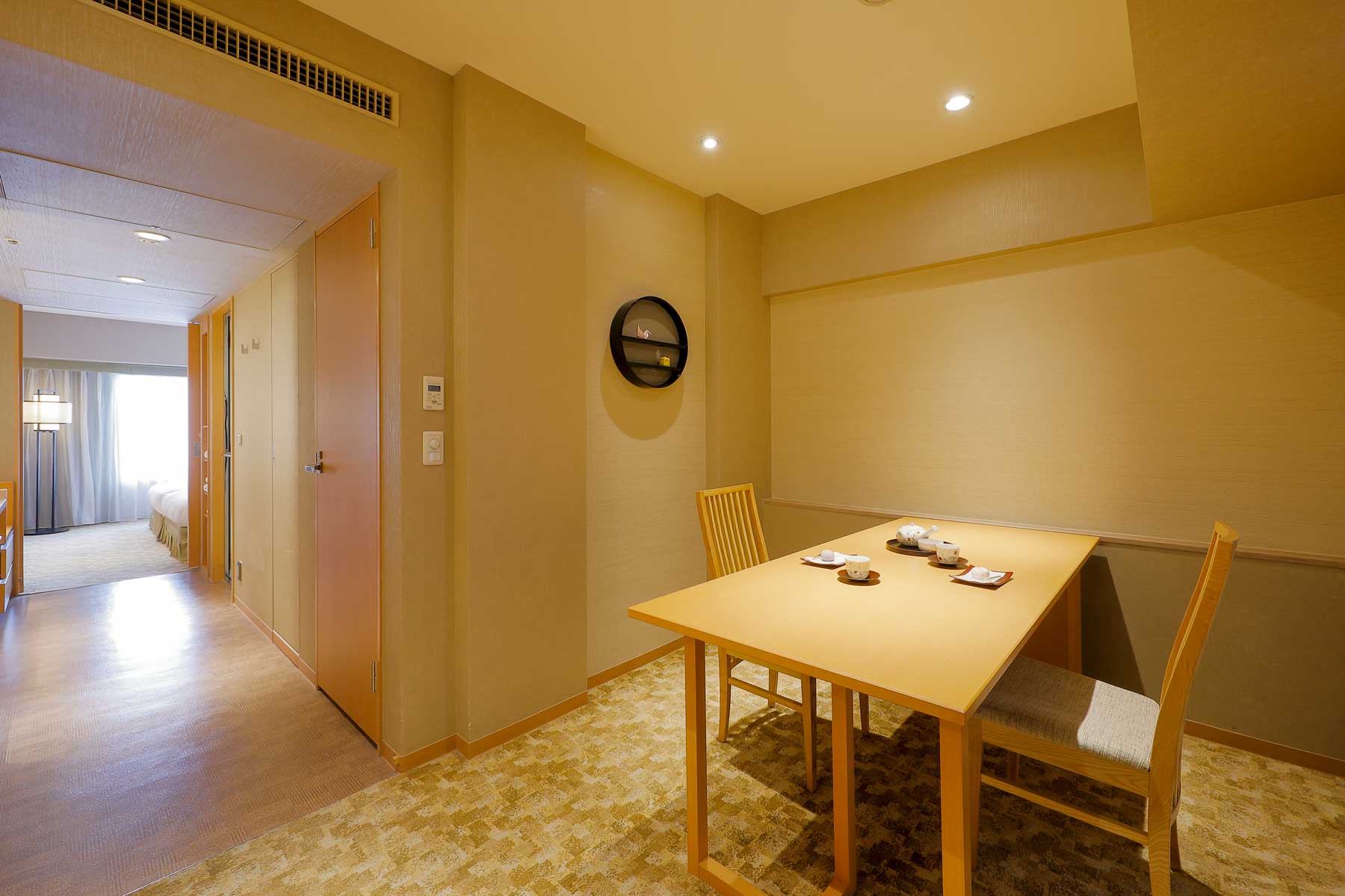 和の趣あふれる色調のお部屋は、お二人でのご滞在でも各々の時間を確保できるようリビングとベッドスペースが独立。