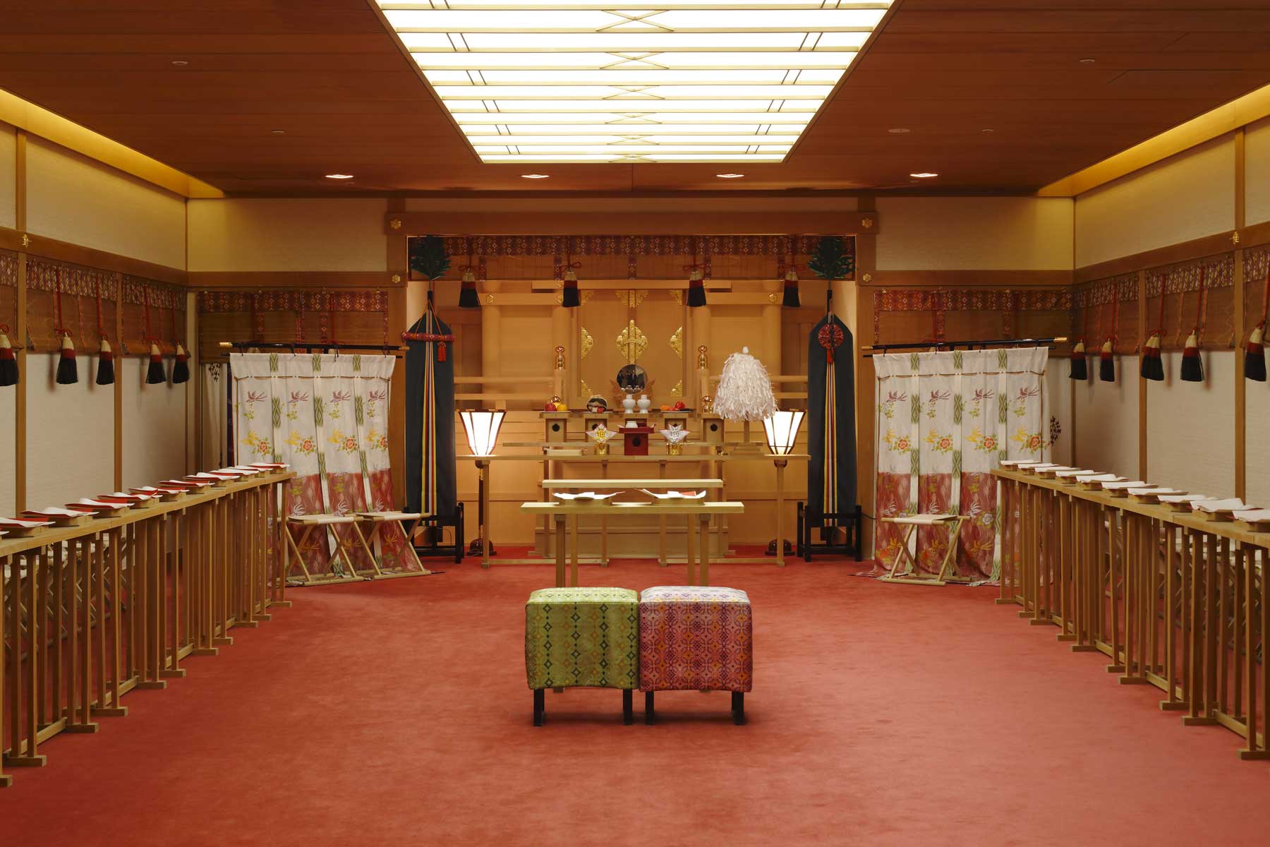 鴛鴦殿は、世界文化遺産「賀茂別雷神社(上賀茂神社)」の分祀として許された全国でも珍しい式場。日本古来の伝統と美風を継承した儀式は、厳粛さの中にも温かさを感じます。